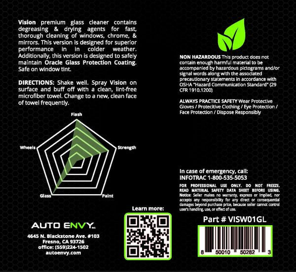 Vision premium glass cleaner contains degreasing & drying agents for fast, thorough cleaning of windows, chrome, & mirrors. This version is designed for superior performance in a colder weather. Additionally, this version is designed to safely maintain Oracle Glass Protection Coating. Safe on window tint.