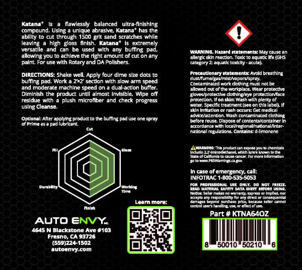 Katana+ is a flawlessly balanced ultra-finishing compound. Using a unique abrasive, Katana+ has the ability to cut through 1500 grit sand scratches while leaving a high gloss finish. * Removes 1500 Grit or Finer Scratches * Heavy Cutting, Fine Finishing * Body Shop Safe